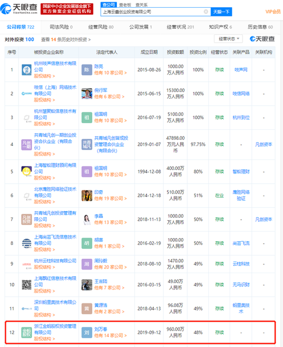 新浪科技讯 9月19日下午消息,天眼查数据显示,9月12日,蚂蚁金服全资控股公司上海云鑫创业投资有限公司新增对外投资,出资960万人民币,持股48%,参与成立浙江金蚂股权投资管理有限公司,并成为公司大股东。