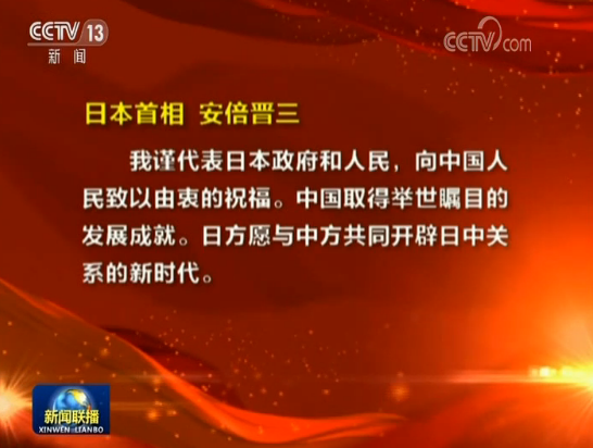 日本首相安倍晋三表示,我谨代表日本政府和人民,向中国人民致以由衷的祝福。中国取得举世瞩目的发展成就。日方愿与中方共同开辟日中关系的新时代。