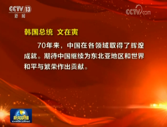 韩国总统文在寅表示,70年来,中国在各领域取得了辉煌成就。期待中国继续为东北亚地区和世界和平与繁荣作出贡献。