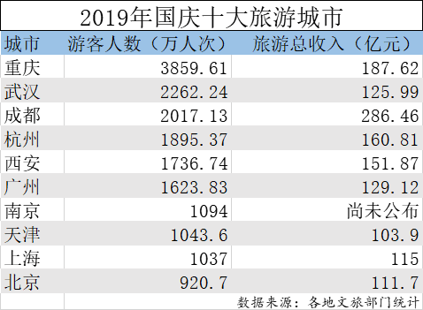 国庆假期旅游数据陆续发布,第一财经梳理出游客人数和旅游总收入排名前十的城市发现:重庆以3859.61万人次摘取全国接待游客最多的城市;成都以旅游总收入286.46亿元成为赚钱最多的城市。