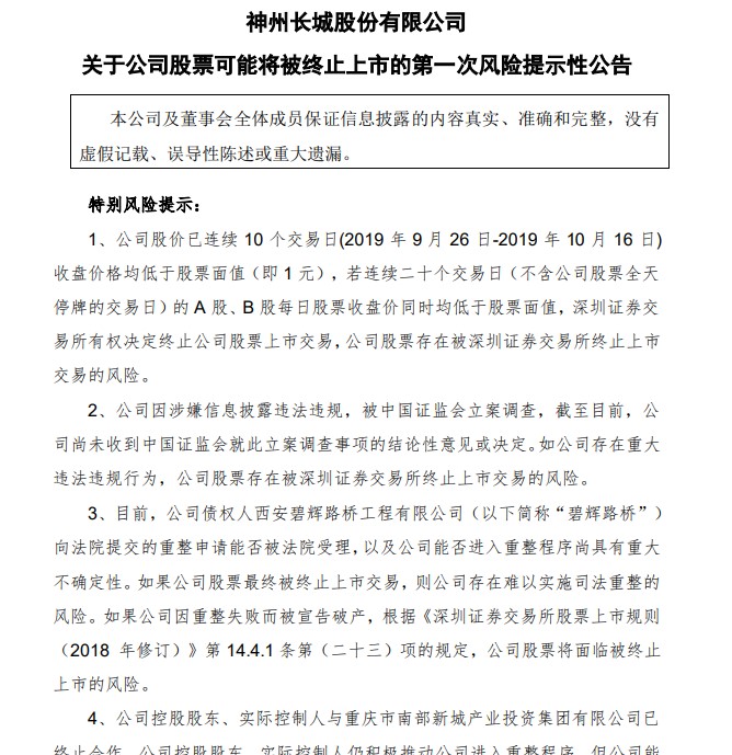 16日晚间,神州长城便根据规定披露了《关于公司股票可能将被终止上市的第一次风险提示性公告》,因为神州长城的股价已连续10个交易日(2019年9月26日-2019年10月16日)收盘价格均低于股票面值(即1元),若连续二十个交易日(不含公司股票全天停牌的交易日)的A股、B股每日股票收盘价同时均低于股票面值,深圳证券交易所有权决定终止公司股票上市交易,公司股票存在被深圳证券交易所终止上市交易的风险。
