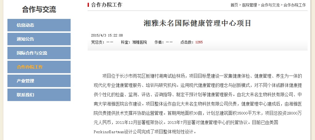 不过,湘雅医院官网上仍有部分对项目的介绍资料。其官网“合作办院工作”栏目中的信息显示,湘雅未名国际健康管理中心项目位于长沙市雨花区板塘村湖南试验林场,项目目标是建设一家集健康体检、健康管理、养生为一体的现代化专业健康管理服务、培训与研究机构,整体运作由北大未名生物科技有限公司负责,健康管理中心建成后,由湘雅医院负责提供技术支撑并协助运营管理。另一则2015年8月的消息显示,有两名专家到湘雅未名健康管理中心任职。