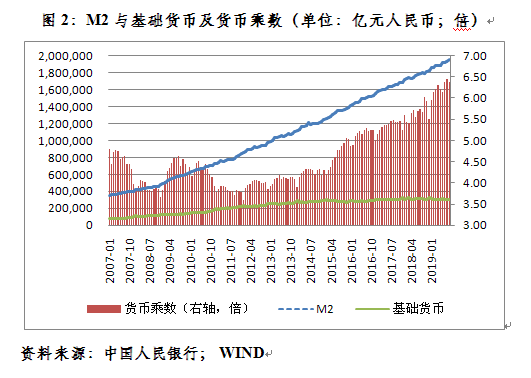这拖累了广义货币供应(M2)增长。截至2019年9月末,M2为195.23万亿元,同比增长8.4%。其中,基础货币投放同比减少3.8%,对当期M2增长为负贡献48.1%;货币乘数升至6.38倍,增长12.6%,为正贡献148.1%(见图2和图3)。