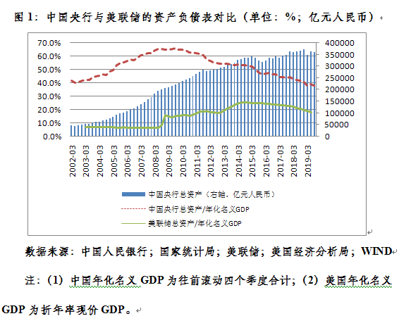 从相对规模变动看,中国央行的“缩表”进度远快于美联储。截至2019年6月末,美联储资产负债表规模相当于年化名义GDP的18.2%,较2014年12月末的历史高点回落了7.3个百分点,远高于2008年9月底全球金融海啸爆发前长期为6.7%左右的水平(见图1)。