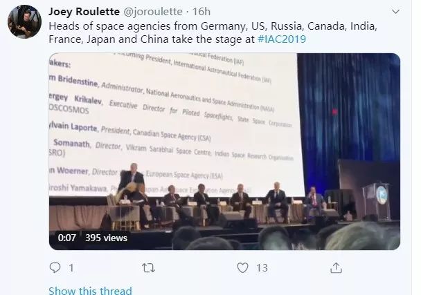 美国石英网(QZ.com)记者Tim Fernholz就在其推特账号上报道了这一幕:在第70届国际宇航大会的开幕式上,一个最大的问题是:中国去哪儿了?