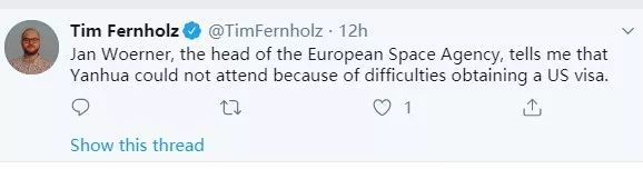 但欧洲空间局的局长简·沃纳(Jan Woerner)却透露,吴艳华没来其实就是因为拿不到美国签证。