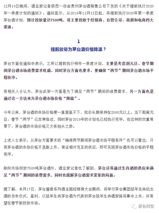 12月11日,有媒体爆料称,贵州茅台(1158.980, -5.42, -0.47%)酒销售公司下发《关于提前执行2020年一季度计划的通知》,从2019年12月12日起,将提前执行2020年第一季度茅台酒计划,预计投放量达7500吨,将主要投放于经销商、自营公司、商超和电商四大渠道。