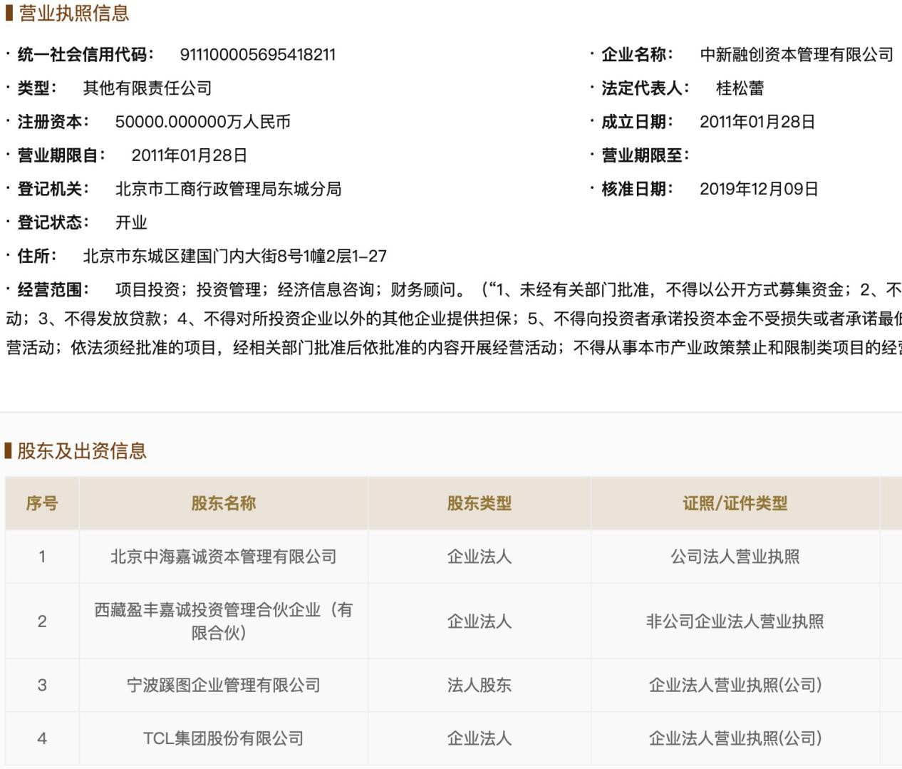 新京报记者获悉,中新融创资本管理有限公司(以下简称“中新融创”)工商资料出现变动,宁波蹊图企业管理有限公司(以下简称“宁波蹊图”)入股,持股比例5%,认缴出资额2500万元。