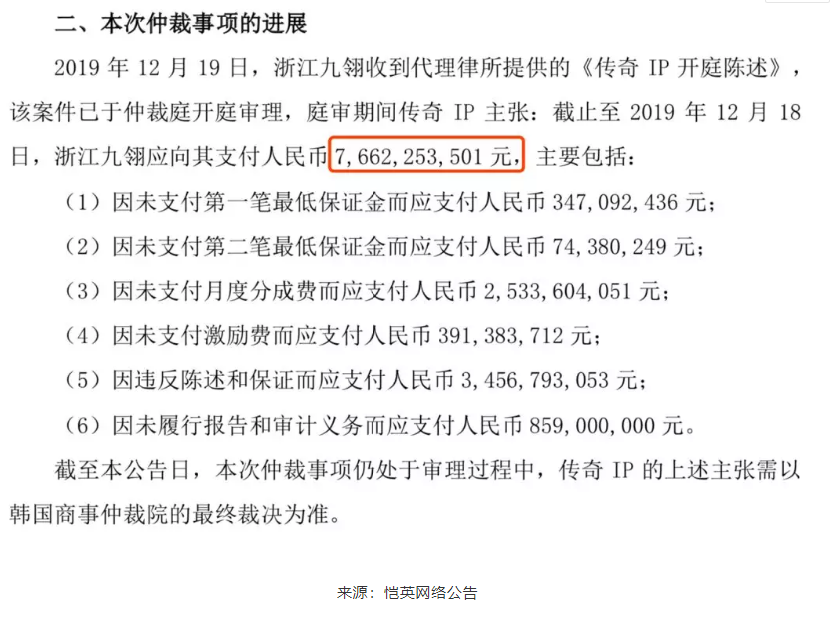 12月20日,恺英网络发布公告称,其控股子公司浙江九翎收到代理律所提供的《传奇IP开庭陈述》,该案件已于仲裁庭开庭审理,庭审期间传奇IP(ChuanQi IP Co., Ltd.,即传奇IP株式会社,简称“传奇IP”)主张:截止至2019年12月18日,浙江九翎应向其支付人民币76.62亿元。