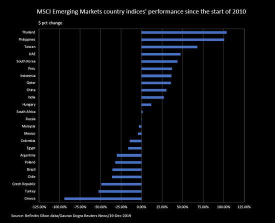 泰国和菲律宾领涨新兴市场股市,在过去十年中涨幅均超过50%以上,而希腊、土耳其和捷克则以负回报垫底。
