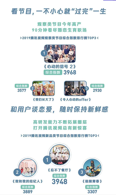 综艺市场同样呈现了“数量减少,需求增加”的特点。报告显示,2019年腾讯视频上线节目216部,较2018年减少36档,不过综艺频道的人均观看时长35.19分钟,较去年增加了1.55分钟。题材方面,综艺节目涉及的领域不断扩圈,一定程度上为音乐、影视、脱口秀、体育、电竞等领域赋能,观察类节目持续增加,从情感、成长、职场等多个角度出发,关照社会现实,引发用户共情。