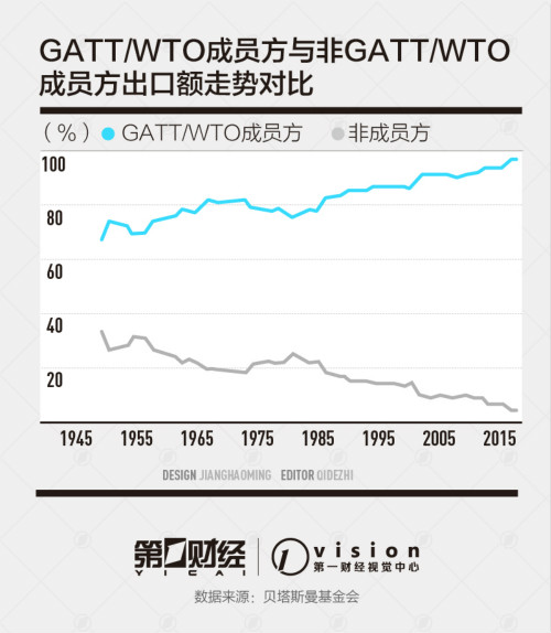 据计算,从1980年至2016年,非WTO成员方出口额平均下降5.5%,GATT/WTO成员方出口额同期则增长了约14%。