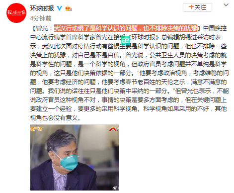 中国疾控中心流行病学首席科学家曾光在接受《环球时报》总编辑胡锡进采访时表示,武汉此次面对疫情行动有些慢主要是科学认识的问题,但也不排除一些决策上的犹豫,对自己是不是自信。曾光说,公共卫生人员的决策考虑的就是科学性的问题,是一个科学的视角,但政府官员考虑问题并不单纯是科学的视角,这只是他们决策依据的一部分。“他要考虑政治视角,考虑维稳的问题,他要考虑经济的问题,他要考虑春节老百姓的天伦之乐,满意不满意的问题。我们说的话往往只是他们决策中采纳的一部分。”但曾光也表示,不能说政府官员这种视角不对,事情的决策是要多方面考虑的,但在关键问题上要建立一个经验,要更多的采用科学视角。科学视角如果采用的不好,其他视角也会没有意义。