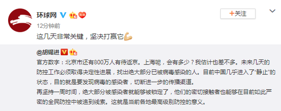 如果在春节后返回工作地的浪潮之前完成这项工作,那么800万人返回北京和差不多的人口返回上海就不会很危险。否则的话,北京上海将很难逃脱疫情进一步爆发的命运。所以啊,一不做二不休,这几天非常关键,除了坚决打赢它,中国别无选择。