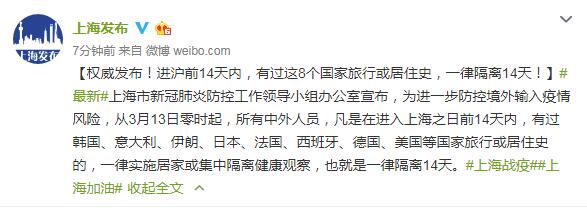 上海市新冠肺炎防控工作领导小组办公室宣布,为进一步防控境外输入疫情风险,从3月13日零时起,所有中外人员,凡是在进入上海之日前14天内,有过韩国、意大利、伊朗、日本、法国、西班牙、德国、美国等国家旅行或居住史的,一律实施居家或集中隔离健康观察,也就是一律隔离14天。