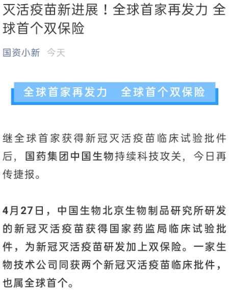 记者4月27日晚间获悉,在国药集团中国生物武汉生物制品研究所与中科院武汉病毒研究所协同攻关,于4月12日率先获得全球首个新冠病毒灭活疫苗临床试验批件后,4月27日,国药集团中国生物北京生物制品研究所研发的新冠灭活疫苗也获得了国家药监局临床试验批件,为国药集团的新冠灭活疫苗研发加上双保险。