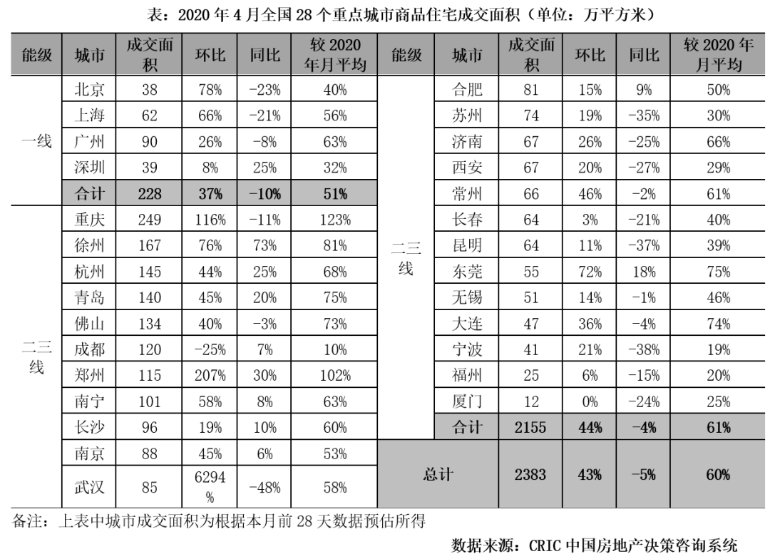 伴随着供应稳步放量,4月楼市成交随之也显著回升。克而瑞数据显示,28个重点城市整体成交面积2383万平方米,环比增长43%,同比微跌5%,显著超过2020年月均水平。
