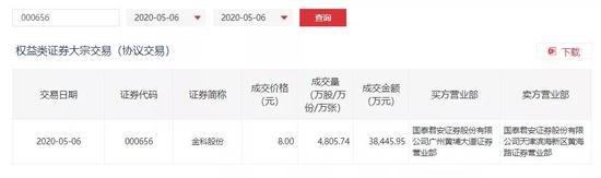 5月6日,金科股份盘后大宗交易,成交量为4805万股,成交单价8.00元,总成交金额3.84亿元;5月7日,金科股份成交17.51亿元大宗交易,累计成交数量2.19亿股,成交价格8元/股。