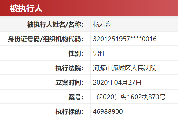 近日,新京报记者自最高法执行信息公开网获悉,杨寿海于2020年4月27日被列为被执行人,执行法院为河源市源城区人民法院,案号(2020)粤1602执873号,执行标的为“46988900”。