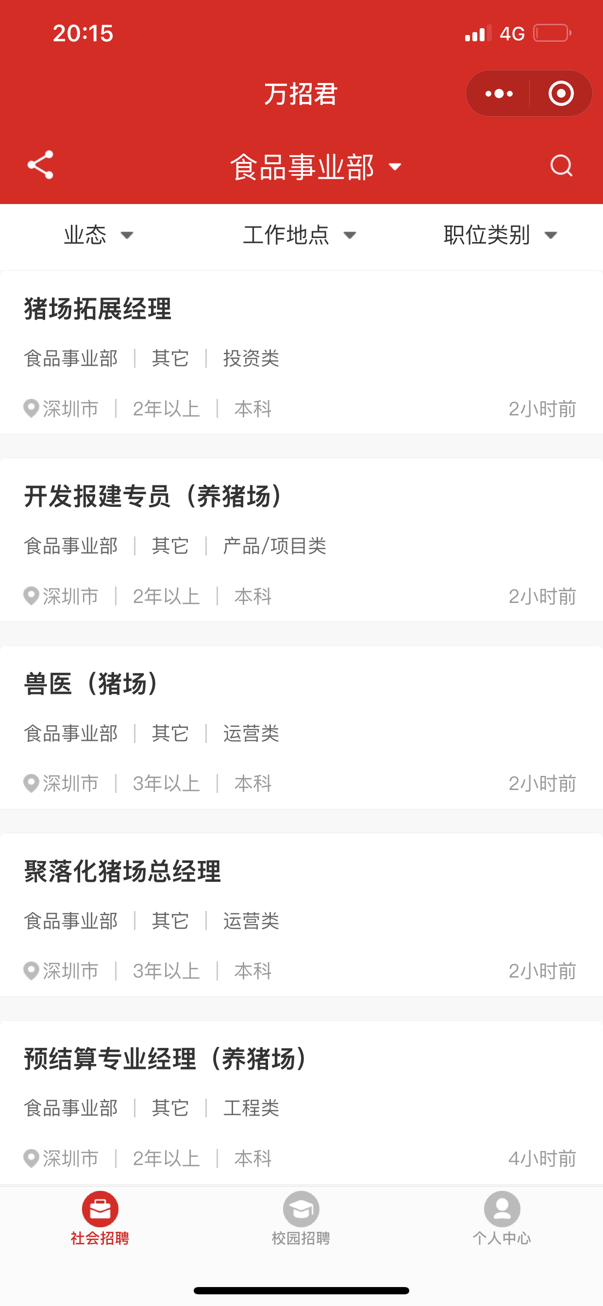 从万科食品事业部最新发布的人才招募信息可以看到,万科此次将向社会招募生猪养殖行业的优秀人才。具体公布的职位包括:猪场拓展经理、聚落化猪场总经理(养猪场)、预结算专业经理、猪场开发报建专员、猪场兽医,要求本科且有两年以上工作经验,工作地点均在深圳。