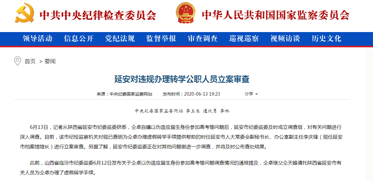 据中央纪委国家监委网站消息,6月13日,记者从陕西省延安市纪委监委获悉,仝卓自曝以伪造应届生身份参加高考等问题后,延安市纪委监委及时成立调查组,对有关问题进行深入调查。目前,该市纪检监察机关对现已查明为仝卓办理虚假转学手续提供帮助的时任延安市人大常委会副秘书长、办公室副主任李庆锋(现任延安市档案馆馆长)进行立案审查。另据了解,延安市纪委监委正在对其他问题做进一步调查,并将及时公布查处结果。