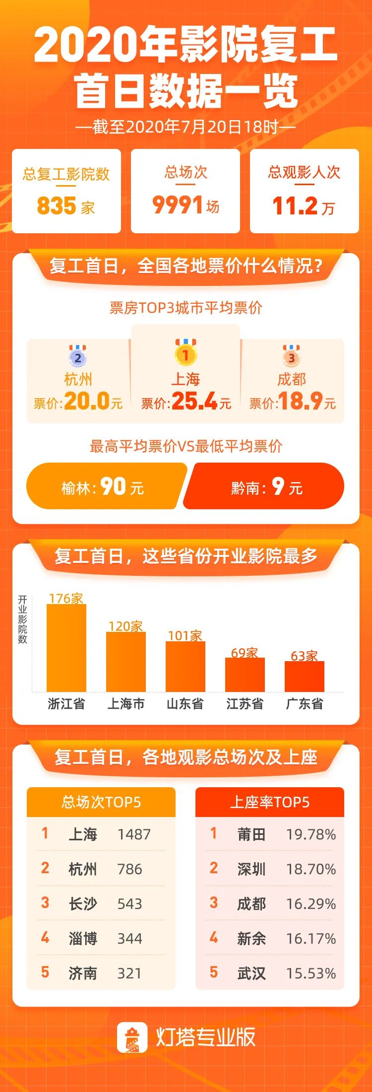 由于影院复工首日恰逢周一工作日,上座率并不高。截至7月20日晚记者发稿前,灯塔专业版数据显示,票房达240万元,总出票近11万张。其中,《第一次的别离》收获105.81万元票房,全天票房占比43.8%。其他几部复映电影《误杀》《寻梦环游记》《战狼2》票房分别为36.91万元、31.99万元、10.07万元。