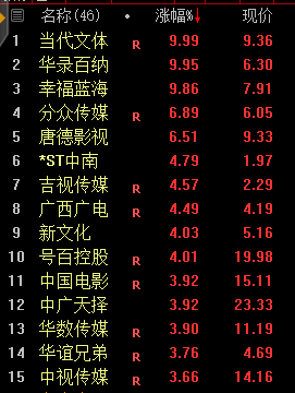 受利好消息刺激,影视股今日表现活跃。截至收盘,当代文体(9.360,0.85, 9.99%)、华录百纳(6.300, 0.57, 9.95%)涨停,幸福蓝海(7.910,0.71, 9.86%)、分众传媒(6.050, 0.39, 6.89%)、唐德影视(9.330, 0.57,6.51%)、新文化(5.160, 0.20, 4.03%)涨幅超4%,中国电影(15.110,0.57, 3.92%)、华谊兄弟(4.690, 0.17, 3.76%)、上海电影(18.260,0.62, 3.51%)涨超3%。