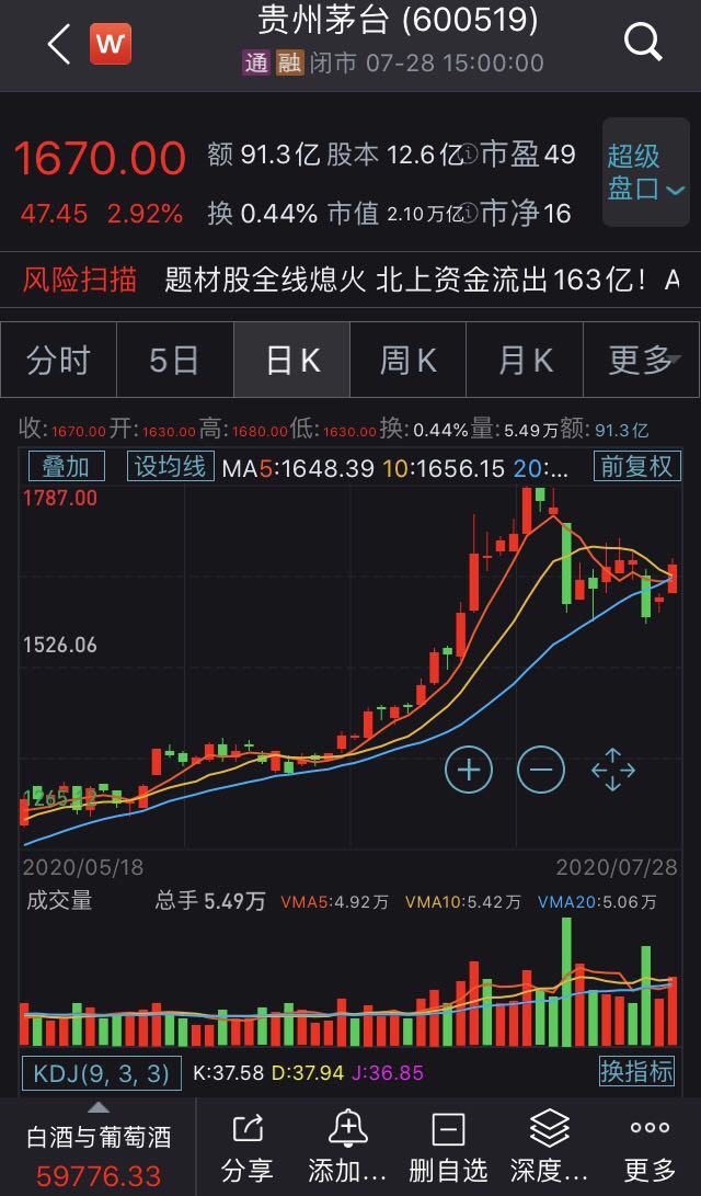 虽然业绩增速放缓,但贵州茅台在资本市场备受青睐,股价屡创新高。今年以来,茅台股价稳步上升,每股价格最高创下1787元。截至7月28日收盘,茅台报1670元/股,较上一交易日涨2.92%,总市值约2.1万亿元,较今年年初已增逾7000亿元。