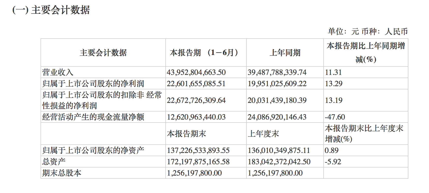A股“股王”贵州茅台(1670.000, 47.45, 2.92%)半年报出炉。