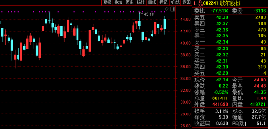 歌尔股份主要从事声学、传感器、光电、3D封装模组等精密零组件,以及虚拟/增强现实、智能穿戴、智能音频、机器人(15.090, -0.19, -1.24%)等智能硬件的研发、制造和品牌营销。三季报显示,公司前三季度实现营收347.3亿元,同比增长43.9%;归母净利润为20.16亿元,同比增长104.71%;基本每股收益0.63元。其中,公司第三季度实现归母净利润12.36亿元,同比增长167.92%。
